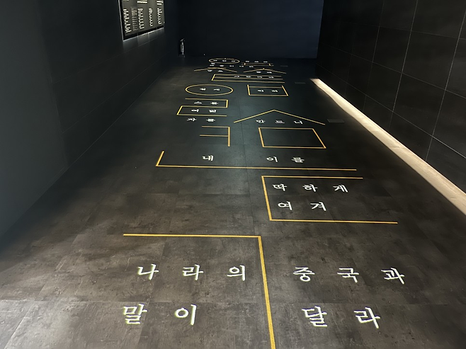 전시는 창제 이유, 과정, 사용 역사까지 시간 순으로 진행한다. 정보만 전달하는 지루한 전시가 아니라 화려한 미디어 아트와 체험 공간까지 있어 어른과 아이가 함께 관람하기 좋다. 전시관 입구에는 해례본을 활용한 땅따먹기 게임이 바닥에 그려져 있다.