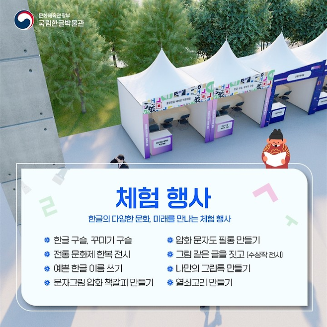 체험거리로는 한글 구슬 꾸미기, 압화 문자도 필통 만들기, 한글 그립톡 만들기, 한글 스티커 사진 찍기, 한글 책갈피 만들기, 한글 네일아트 등이 있어 아이들과 즐거운 시간을 보낼 수 있다.