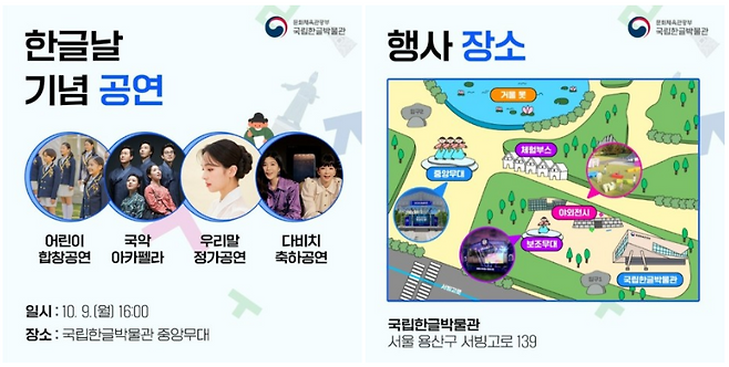 올해 한글 주간은 더욱 풍성하다. 거울못 앞에는 유명 가수 공연이 열리는 야외 무대를, 한글박물관으로 통하는 숲길에는 각종 체험 부스를, 박물관 야외 잔디밭은 한글 자음 모양 조형물을 설치해 화려하고 다채로운 축제를 연다. 축하 공연은 다비치, 어린이 합창단 등 여러 가수가 참여하며 한글날 당일 오후 4시부터 열린다.