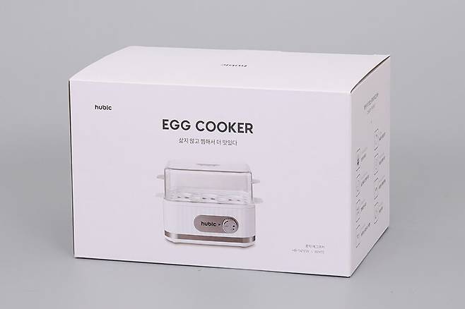 휴빅 에그&푸드 쿠커 계란찜기 HB-141E는 골판지 박스와 일반 박스의 2중 포장으로 되어 있다. 안쪽의 박스는 흰색 바탕 앞쪽에 제품의 컬러 이미지가 인쇄되어 있다.