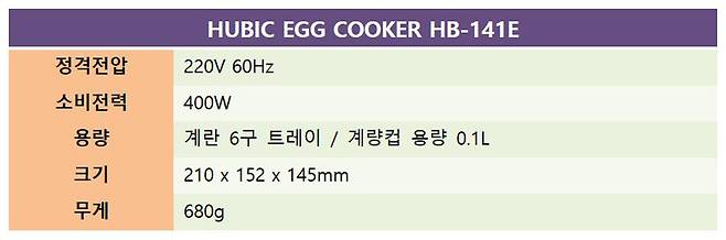 계란은 평상시에도 자주 먹게 되지만, 근력 운동을 하거나 다이어트를 할 때도 애용되고 있다. 하지만 번거로운 조리 과정 때문에 귀찮아서 안 먹게 되기도 하고, 반숙을 만들고 싶은데 완숙이 되거나 완숙을 해서 다른 요리에 넣어야 하는데 반숙이 되는 바람에 낭패를 보기도 한다. 휴빅 에그&푸드 쿠커 계란찜기 HB-141E는 간편하게 계란을 찔 수 있는 조리 도구로, 촉촉한 반숙과 부드러운 반숙, 단단한 완숙까지 골든 타임을 정확하게 맞춰줘 원하는 상태로 쉽게 익힐 수 있다.