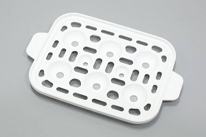 투명 커버 안쪽에는 구멍이 숭숭 뚫린 계란 트레이가 있다. 계란 트레이에는 총 6개의 계란을 올려둘 수 있는 홈이 있기 때문에 한 번에 최대 6개의 계란을 찔 수 있다.