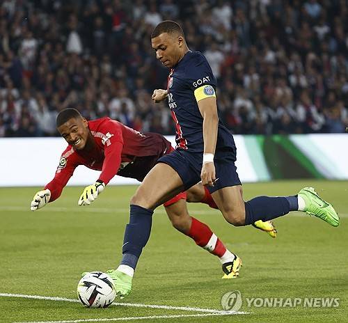epa11335997 Kylian Mbappe of Paris Saint Germain (front) scores the 1-0 goal against goqlkepper Guillaume Restes of Toulouse FC during the French Ligue 1 soccer match between Paris Saint-Germain (PSG) and Toulouse (TFC) in Paris, France, 12 May 2024. EPA/MOHAMMED BADRA
