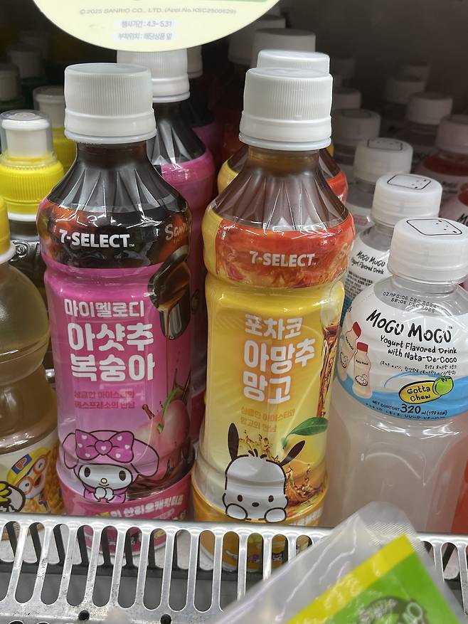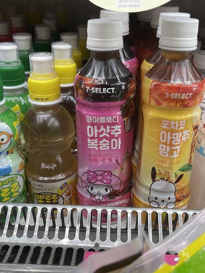 복숭아 통조림 국물을 마시는 것 같은 단맛 강한 복숭아 음료에요. 산리오 캐릭터 키링이 페트병 하단에 들어있어 신기했요.