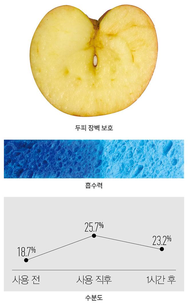 방법 스펀지에 동일한 양의 제품을 바른 후 10분 뒤 단면을 확인한다. 흡수된 제품의 범위가 넓을수록 흡수력이 높다고 본다.