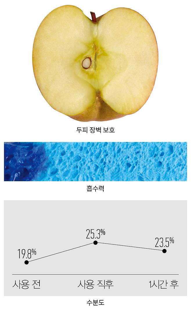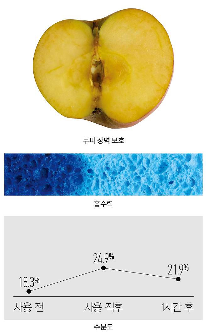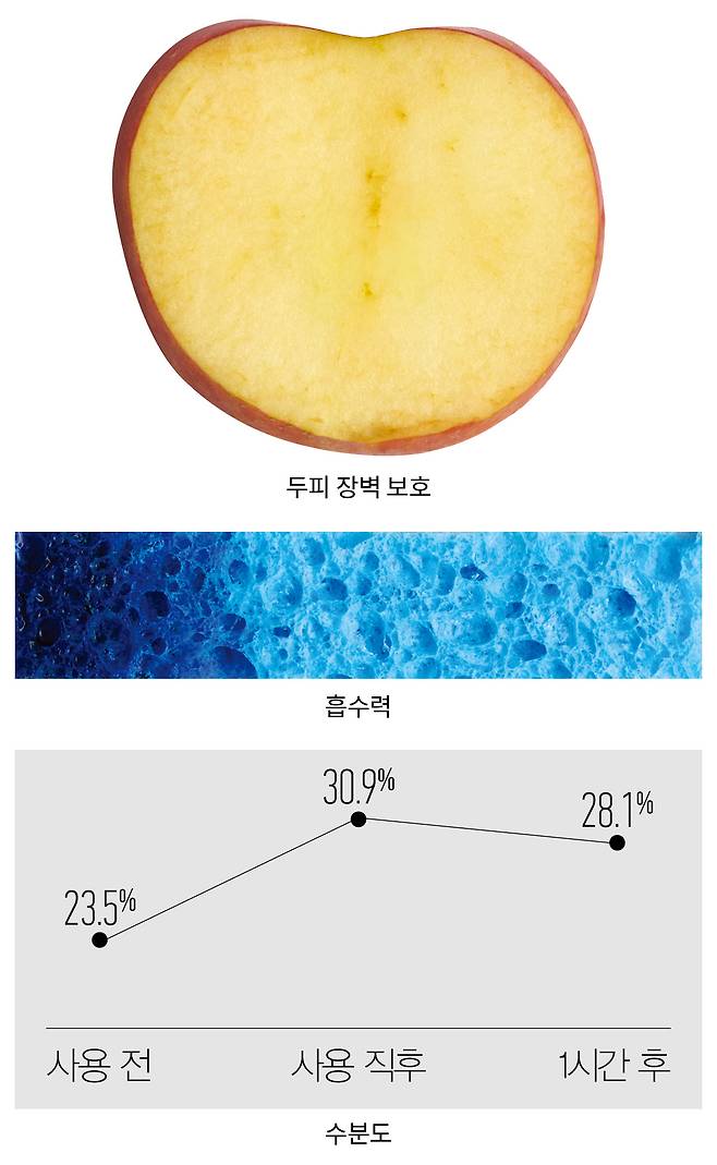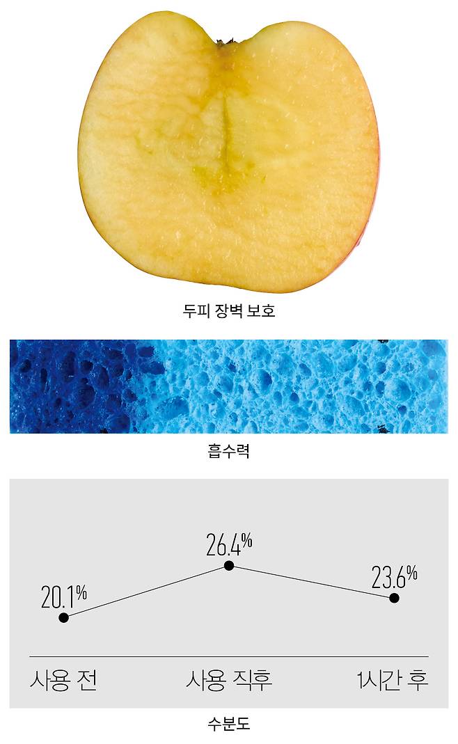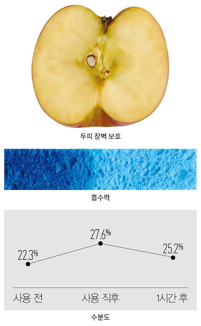 방법 같은 두께로 자른 사과의 단면에 제품을 바르고, 8시간 후 사과 상태를 관찰한다.