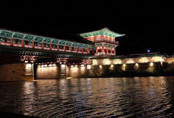 2018년에 복원된 월정교는 경주의 새로운 야경 명소로 자리잡았습니다. 밤이 되면 교각 아래에 설치된 조명이 켜져 물에 비치는 모습이 아름답습니다.