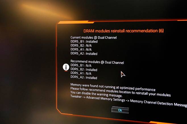단....메인보드 상에 적혀 있는 우선 메모리 슬롯이 B1/A2로 표기가 되어 있지만, 메인보드 바이오스상에서는 평소에 알고 있는 슬롯인 B2/A2 입니다. 메인보드상에 표기가 오류가 있는것 같네요