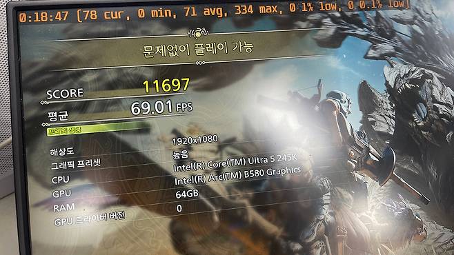 평균 69 프레임으로 게임 진행이 가능하지만 실질적으로 벤치 도중에 50프레임 초반대까지나 꺽이는 구간이 있어서 그래픽 설정 부분을 일부 조정이 불가피해보였습니다.
