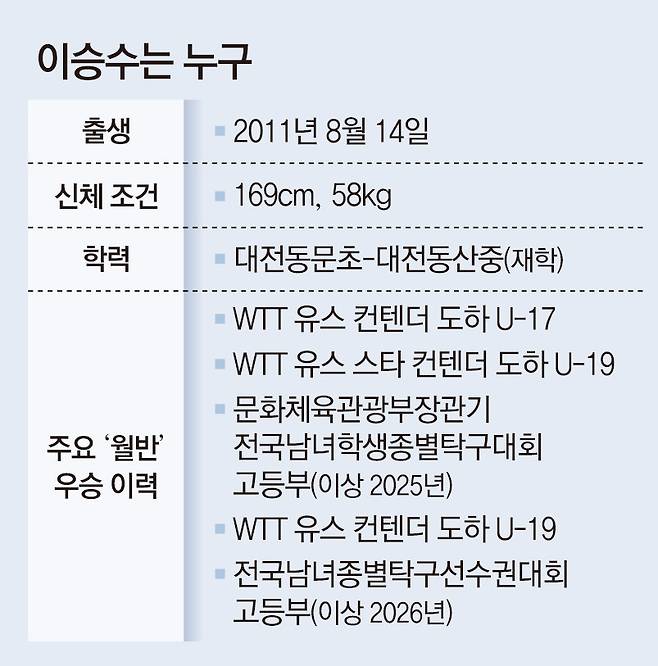 ‘월반 우승’은 이승수에게는 익숙한 일이다. 15세 이하 선수 중 세계랭킹 1위에 올라 있는 이승수는 지난해 열린 월드테이블테니스(WTT) ‘유스 컨텐더 도하’ 17세 이하 단식과 ‘유스 스타 컨텐더 도하’ 19세 이하 단식, 올해 1월 열린 유스 컨텐더 도하 19세 이하 단식에서 정상에 올랐다.