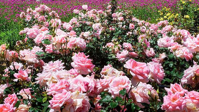 그 뒤로 이어지는 꽃양귀비와 피튜니아, 장미 등 다양한 꽃들이 자연스럽게 구역을 나누고 있어 길을 따라 걷는 것만으로도 다채로운 감성을 느낄 수 있다.