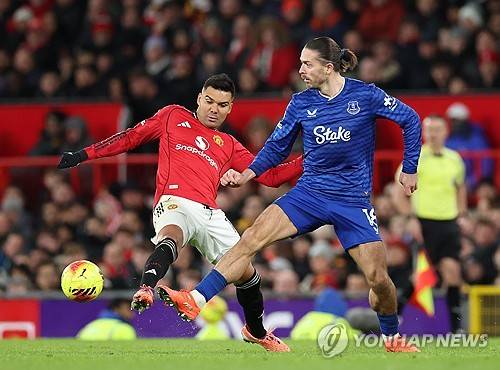 epa12546744 Casemiro of Manchester United (L) in action against Jack Grealish of Everton (R) during the English Premier League match between Manchester United and Everton FC in Manchester, Britain, 24 November 2025. EPA/ADAM VAUGHAN EDITORIAL USE ONLY. No use with unauthorized audio, video, data, fixture lists, club/league logos, 'live' services or NFTs. Online in-match use limited to 120 images, no video emulation. No use in betting, games or single club/league/player publications.