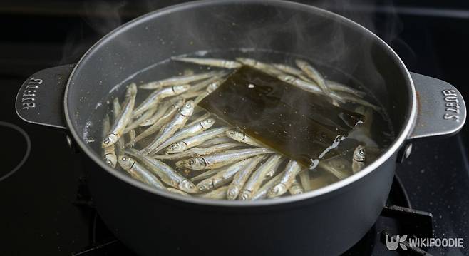 먼저, 육수를 내야 한다. 물 4컵에 마른 멸치 20마리, 다시마 한 장(10×10cm)을 넣고 찬물 상태에서 끓이기 시작한다. 물이 끓기 시작하면 다시마는 건지고, 멸치는 남긴 채 15분 더 끓인다. 이후 멸치도 건진다.