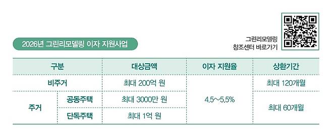 지원도 확대됐어요. 기본 이자 지원율은 기존 4%에서 4.5%로 0.5%p 올라가요. 여기에 에너지 성능개선비율이 30% 이상이거나 차상위계층·다자녀가구·고령자·신혼부부 등에 해당하면 1%p를 추가로 지원해 최대 5.5%까지 혜택받을 수 있어요.