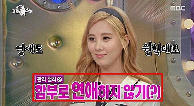 소녀시대 서현은 데뷔 이후 12년 동안 단 한차례도 열애설이 없었던 대표적인 철벽녀인데요. 서현은 평소 자기관리의 독종이라고 불릴 만큼 철저한 관리를 해온 것으로 알려져 있습니다. 실제로 서현은 스스로 반드시 지키는 관리 철칙 두 가지를 밝힌 적이 있는데요. 하나는 '함부로 놀지 않기', '다른 하나는 연애하지 않기'입니다. 이에 대해 규현이 한숨을 쉬며 '서현은 연애 좀 했으면 좋겠다'라고 안타까워하자 서현은 '소문나는 것이 너무 싫다'라며 철벽녀를 자처했습니다.