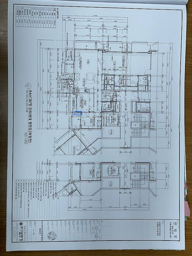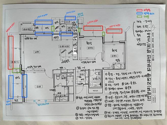 혹시 확장 예정이신 분이 있으시다면, 이렇게 상세 도면을 받아서 제출해야 한답니다. 이 정도까지 상세한 도면은 저는 봐도 잘 모르지만, 확장할 때 필수로 제출해야 하니 받아두면 좋습니다! 확장할 수 있는 벽인지 아닌지도 확인할 수 있어요 :) 파란 네모 박스 쳐진 것처럼 빗금(///)이 쳐진 벽은 부술 수 있는 가벽이라는 뜻이랍니다.