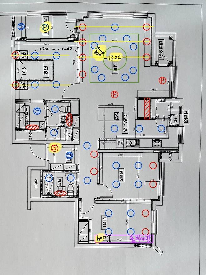 위 도면은 조명만 체크해 본 도면이에요 :) 조명은 한 곳 정도 빼고 도면과 거의 동일하게 시공됐어요!