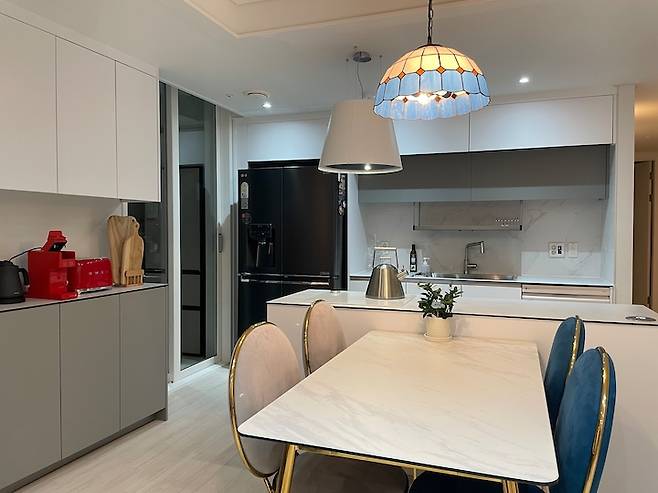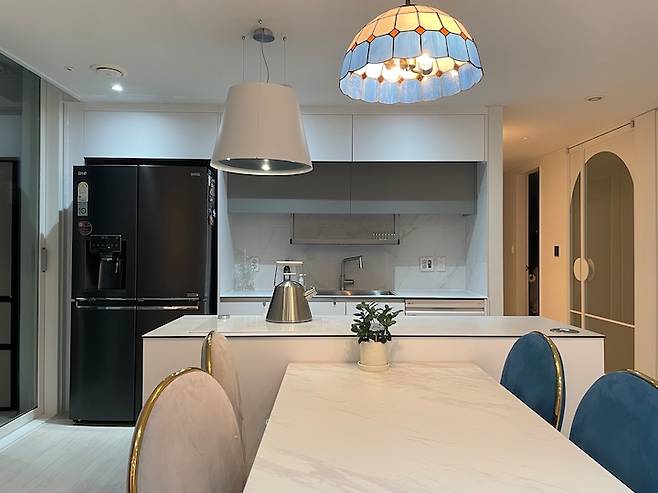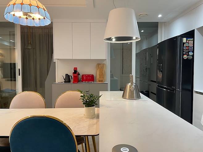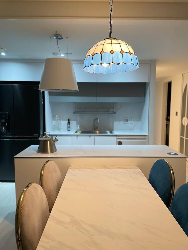 식탁은 신혼 때 샀던 세라믹 식탁이 있어서 주방 상판도 식탁이랑 색깔을 통일했어요. 의자는 벨벳 의자 파란색, 베이지색인데 여름엔 좀 더워서 여름에는 의자를 바꿔야 하나 심각하게 고민했답니다 ㅠ