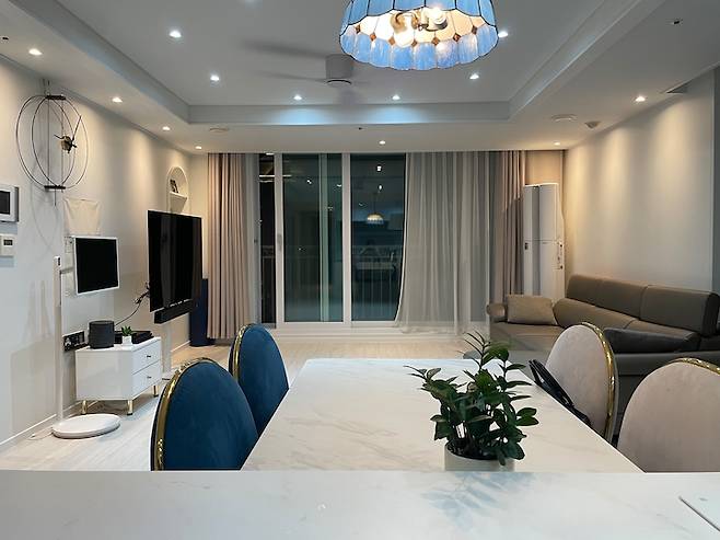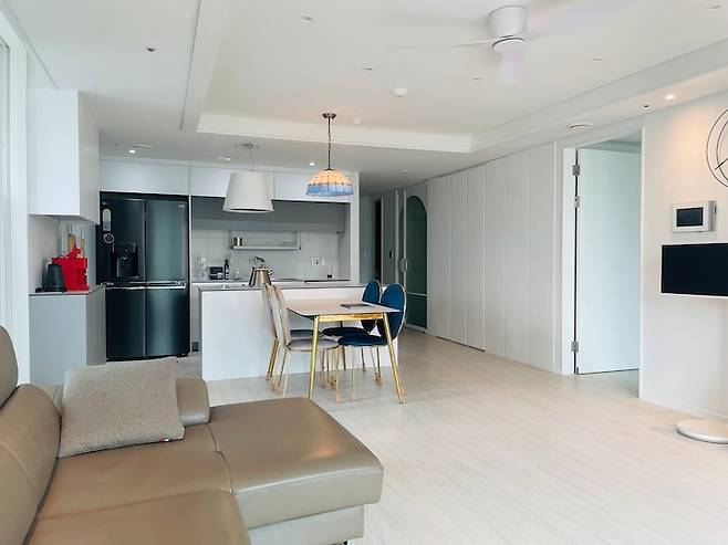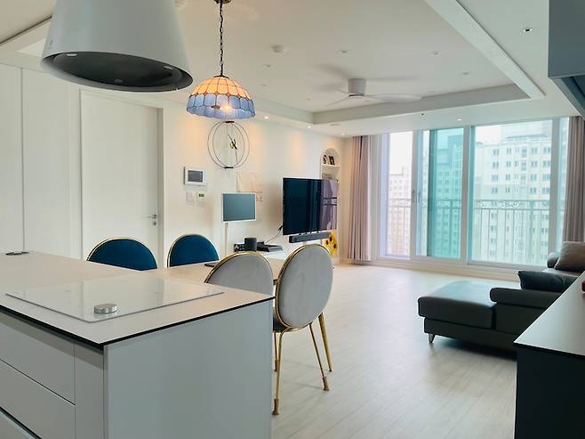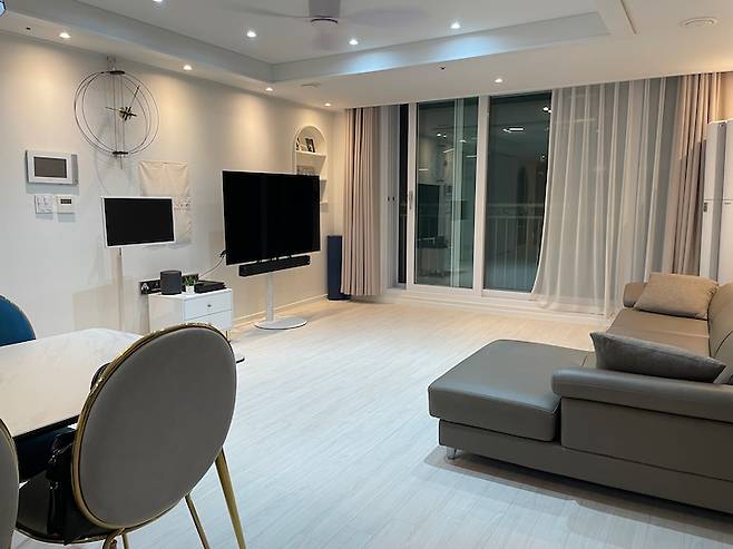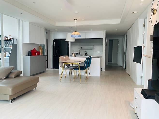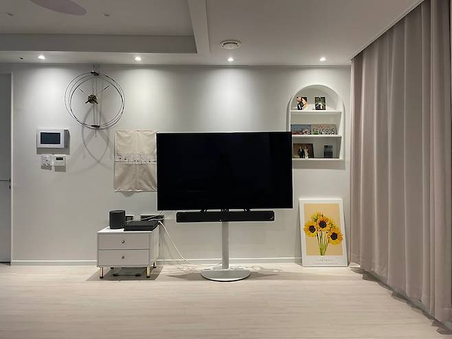 짜잔 - 드디어 이사까지 마친 모습이에요, 거실에는 TV, 소파, 에어컨밖에 없어요 ㅎㅎ 저희 부부는 거실과 주방에서 지내는 시간이 가장 많아요. 주로 집에서 맛있는 걸 만들어 먹고, TV를 보거나 게임을 하며 거실에서 시간을 보내곤 하기 때문에 대면형 주방과 거실에 주로 사용하는 가구들만 깔끔하게 놓고 넓게 쓰길 원했답니다.