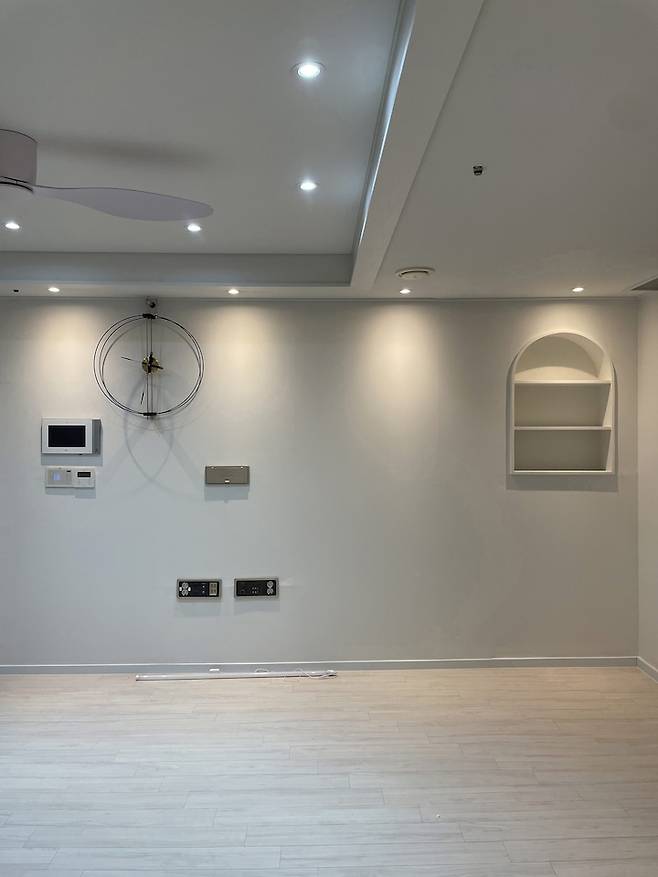 벽으로 바꾼 이유는 바로 요 아치 모양 장을 넣고 싶어서였죠! 거실에 최대한 가구를 간소화하려고 했기 때문에 장을 넣어서 액자나 간단한 소품을 놓으려고 급하게 벽을 막았답니다 ㅎㅎ