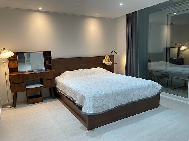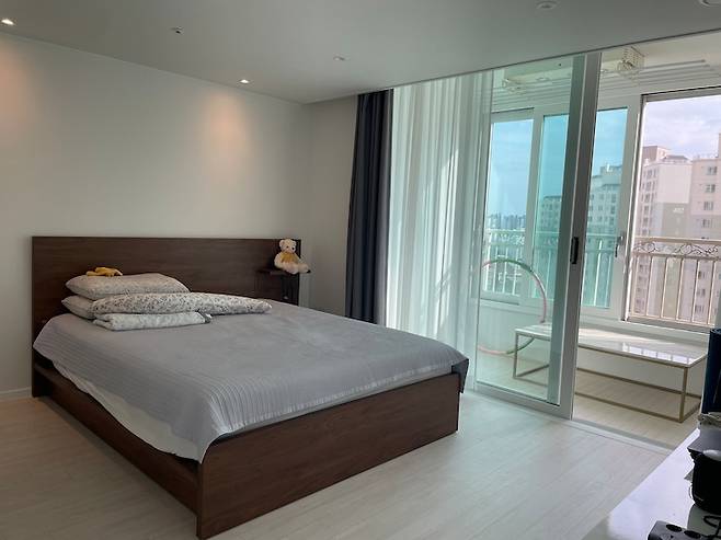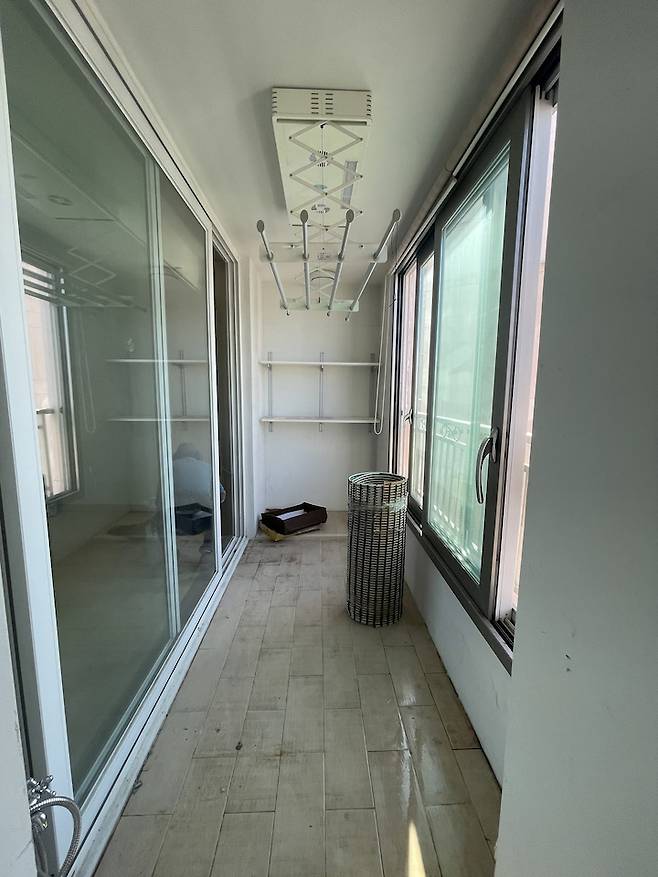 안방 침실을 소개해 드릴게요 :) 기존 안방 베란다 모습이에요, 확장을 하고 싶었지만 지금도 안방이 큰 편이라 수납공간 및 홈 캠핑장으로 활용하고 싶어서 베란다를 확장하지 않았는데 매우 만족하고 있어요 :)