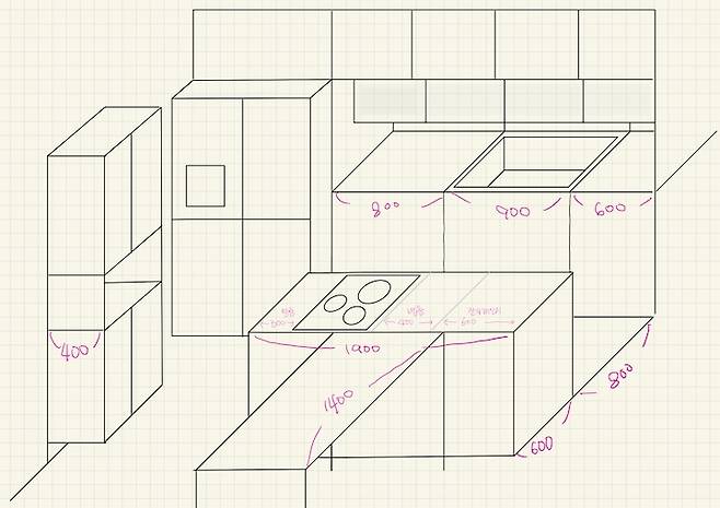 전 디자이너도 아니고 건축 관련 일을 하지도 않지만, 인테리어에 아주아주 관심이 많아요. 또 손으로 직접 그려보고 계획하는 걸 좋아하는 파워 J형이라 아이패드를 활용해서 이런 식으로 그림을 그려서 인테리어 업체에게 전달했었어요 ㅎㅎ