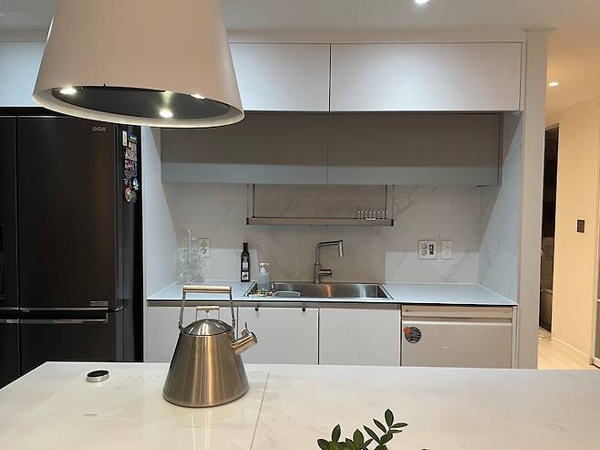 후드는 엘리카 이지 아일랜드 후드예요, 탄소 필터 후드로 후드관이 필요 없어서 인덕션을 아일랜드 장으로 옮겨오기 위해서는 어쩔 수 없는 선택이었어요 ㅠ.ㅠ 하지만 너무 예뻐서 백 점 만점에 백 점...!
