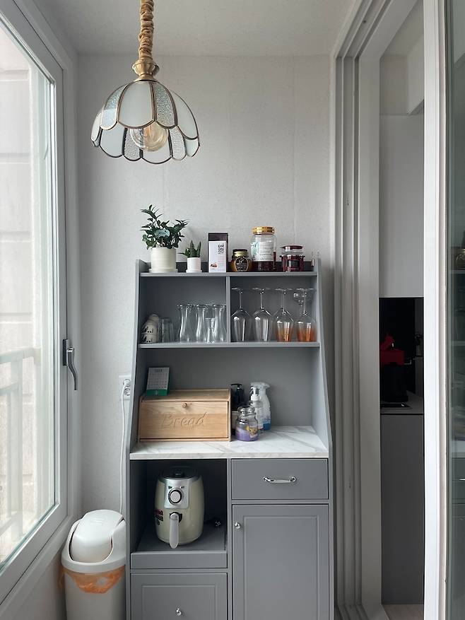 비확장한 곳도 타일을 깔아서 홈바 & 분리수거(휴지통) 놓는 곳으로 너무 잘 사용하고 있어요.