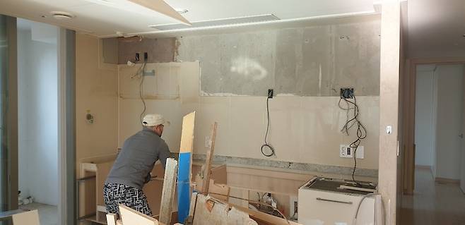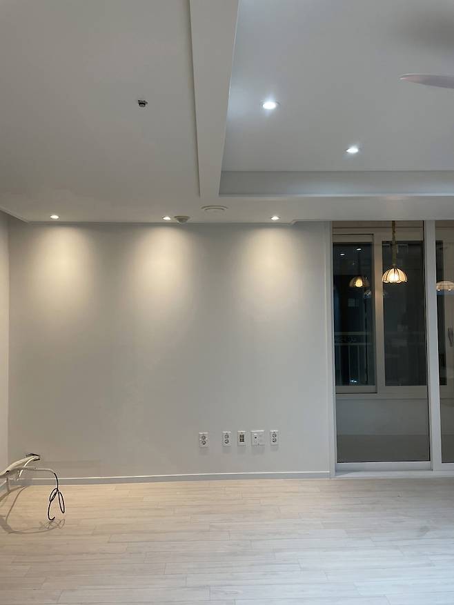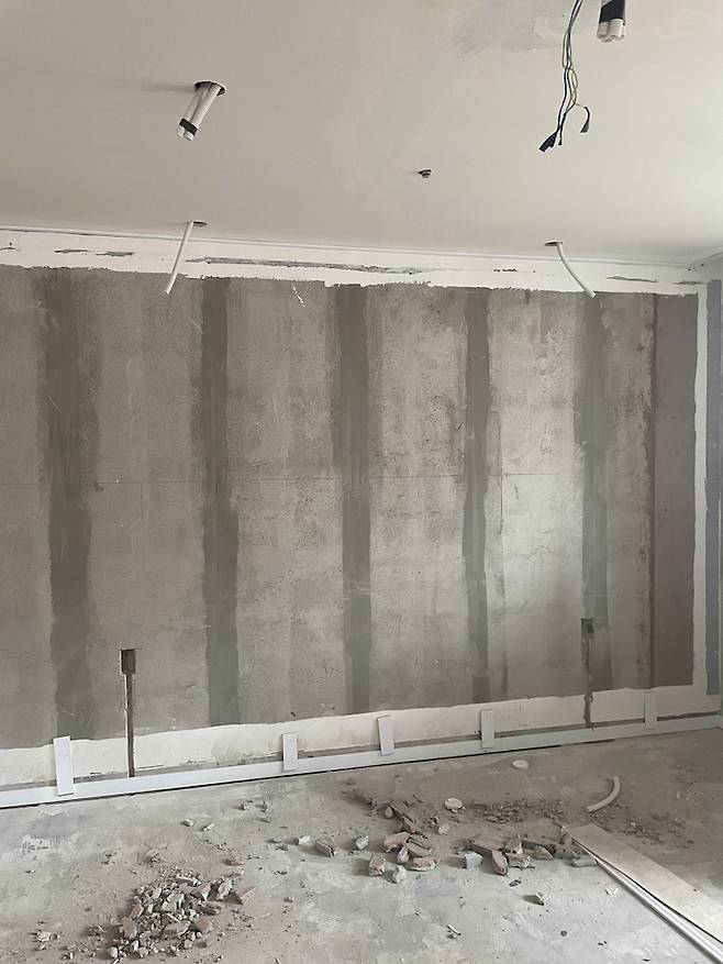 콘센트가 만들어지는 중 +_+ 콘센트가 없는 자리에 새로 만들 때는 주변에 전기에서 끌어와야 하기 때문에 가까운 곳에 콘센트가 있는지 확인해야 해요. 조명도 매립형 6개를 넣었는데, 벽 쪽에는 노란 전구, 중간에는 주백색 전구를 넣었어요 :)