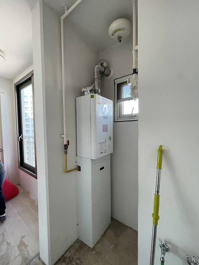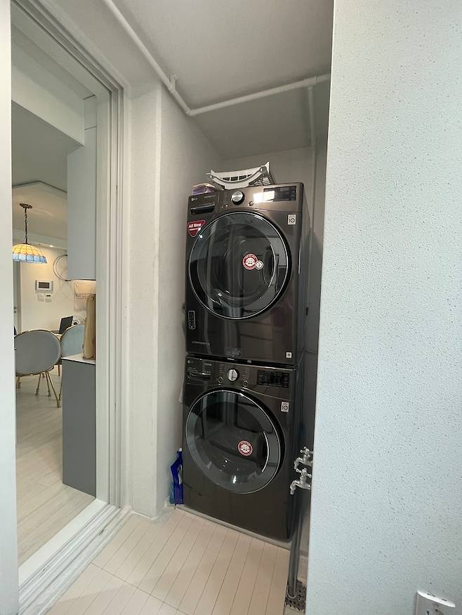 기존에 뚫린 벽을 막고 보일러 옆에 세탁기와 건조기를 병렬로 넣었어요, 보일러를 고치려면 건조기를 분리해야 하는 대참사가 일어나기 때문에 첨부터 보일러를 새로 교체할까 말까 고민을 엄청 했는데, 예산 문제로 그대로 쓰기로 했어요 ㅠㅠ 보일러 문제 생기면 미래의 나야... 잘 부탁해...