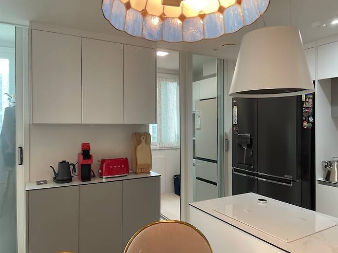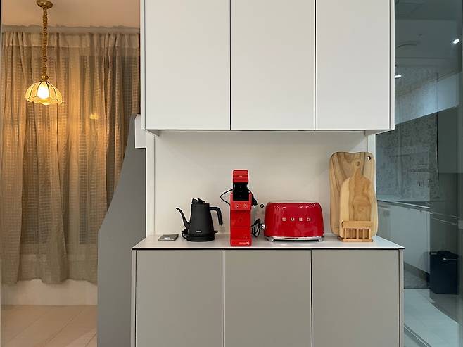 기존에 뚱뚱하고 보기 싫었던 냉장고장은 철거하고 커피머신이 들어갈 정도의 300mm 깊이의 장을 짜서홈카페를 만들었어요 :) 여기도 아래를 회색으로 해서 살짝 포인트를 줬어요