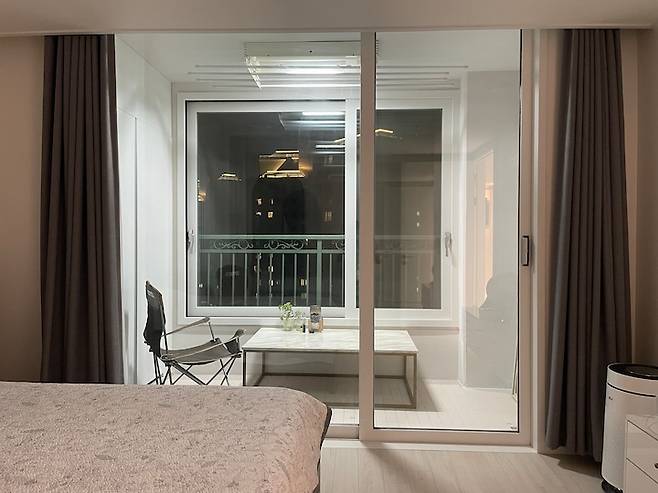 안방 베란다에 있던 식탁은 기존에 거실에 있던 건데요. 너무 크고 자리를 많이 차지해서 버리거나 팔려다가 일단 안방 베란다에서 홈캠핑할때 사용하려고 뒀어요 ㅎㅎ 안방 베란다에서 고기 구워 먹는 게 제 계획이었는데, 콘센트가 없다는 걸 생각 못 해서 고기는 못 구워 먹겠지만, 창이 크고 뷰가 좋아서 저녁에 불멍 하기 좋을 거 같아요 ㅎㅎ