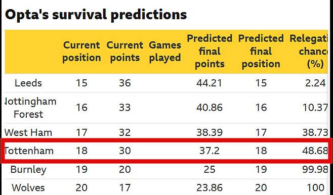 'BBC'는 "현재 18위에 있는 토트넘은 승점 30점을 기록하고 있으며, '옵타'는 토트넘의 최종 승점을 37점으로 예상하고 있다"며 "잔류를 위해서는 38점이 필요하다는 뜻"이라고 짚었다.