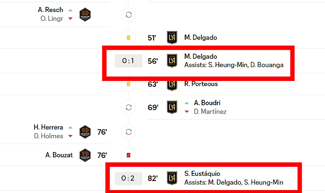 경기 직후 MLS 홈페이지는 이날 델가도의 득점에 손흥민과 드니 부앙가, 유스타키오의 득점에 델가도와 손흥민이 어시스트를 기록했다고 표시했다.