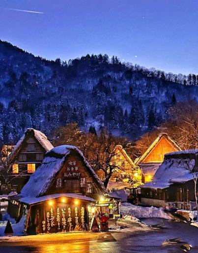 삿포로와 더불어 인기 있는 겨울 일본 여행지 시라카와고는 겨울이면 눈이 쌓인 풍경으로 전세계 관광객들의 사랑을 받는 여행지입니다. 마을 전체가 문화 유산으로 지정된 시라카와고는 독특한 삼각모양 지붕 위 눈이 소복히 쌓이면 아름답기 그지 없다고 합니다.