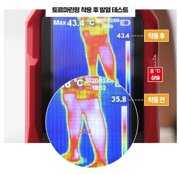 제품 착용 후 약 20분이 지나면 온열감이 느껴집니다. 통증 완화 느낌이 들죠. 발열 테스트 결과에 따르면 착용 전 35.8℃였던 무릎 주변의 온도가 착용 후 43.4℃까지 상승했습니다. 한국원적외선응용편가연구원으로부터 원적외선, 음이온 시험 성적을 인증받았습니다.