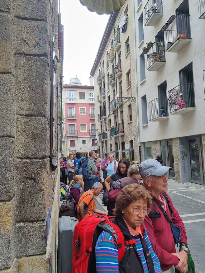 팜플로냐 공립알베르게 앞 줄 서서 대기중인 순례자들