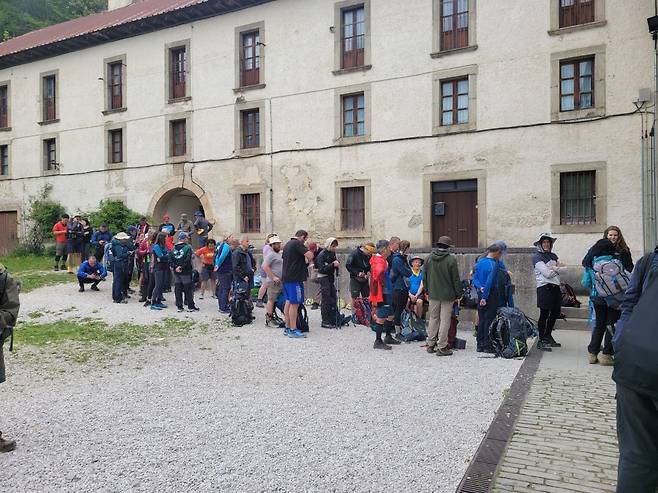 론세스바예스 공립알베르게에서 체크인 순서를 기다리는 순례자들