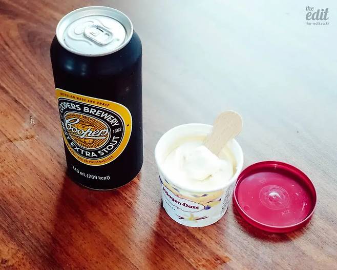 편의점에서도 ‘맥주 플로트’를 만들 수 있다. 맥주 플로트는 아포가토의 알코올 버전이라고 생각하면 쉽다. 바닐라 아이스크림 위에 에스프레소를 부어주듯, 천천히 맥주를 부어주면 된다. 커피 대신 쌉쌀한 흑맥주가 감싸주는 매력이 포인트! 가장 클래식한 버전이 스타우트나 포터 같은 흑맥주다. 편의점 맥주로는 쿠퍼스 스타우트나 코젤 다크를 추천한다.