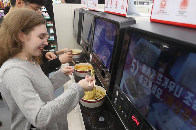 한 외국인 여성은 수십 종류 라면이 들어선 대형 진열장을 한참 살펴보다 '순하군 안성탕면'을 집었다. 그러고는 여러 번 해본 듯한 익숙한 솜씨로 즉석 조리기에서 라면을 끓이기 시작했다.