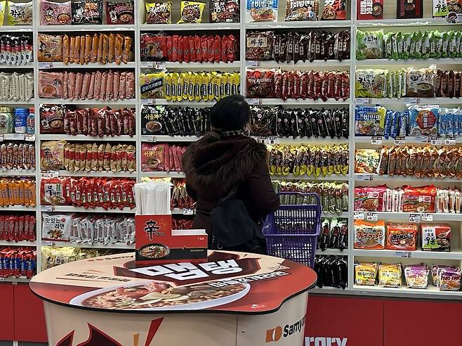 직원에 따르면 순한 맛을 선호하는 이들은 '순하군 안성탕면'과 '사리곰탕'을 많이 찾고, 보편적으로 인기 있는 메뉴는 '너구리'와 '신라면'이다. 최근 출시된 '신라면 툼바'도 인기를 얻고 있다고 했다.