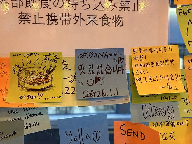 벽에는 형형색색의 메모지가 가득 붙어 있었다. 한국의 라면 맛을 본 외국인 관광객들이 각국의 언어 혹은 한국어로 "한국 라면 정말 맛있게 먹었다. 또 오고 싶다", "한그릇 더 주세요!", "너무 재미있다" 등의 후기를 남긴 것이다.