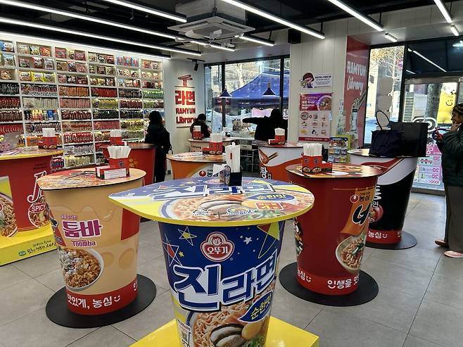 연합뉴스 보도에 따르면 매장 중앙에 마련된 여러 종류의 컵라면 용기를 본떠 만든 대형 시식대는 보는 재미를 더했다.