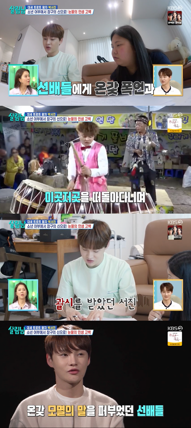 또한 과거에 무대에서 장구를 치며 노래를 했던 박서진은 "그 당시에 가수 품위 떨어뜨린다고 선배들이 뭐라 했다. '네가 가수인데 장구를 치고 있냐'며 막말도 들었다. '너처럼 못생기고 노래도 못하면 가수하지 말아야 한다'는 소리까지 들었다. 그런 말을 한 선배의 전화를 끊고 펑펑 울었다. 돈 없는 것도 못생긴 것도 내 잘못이 아닌데"라고 말했다.