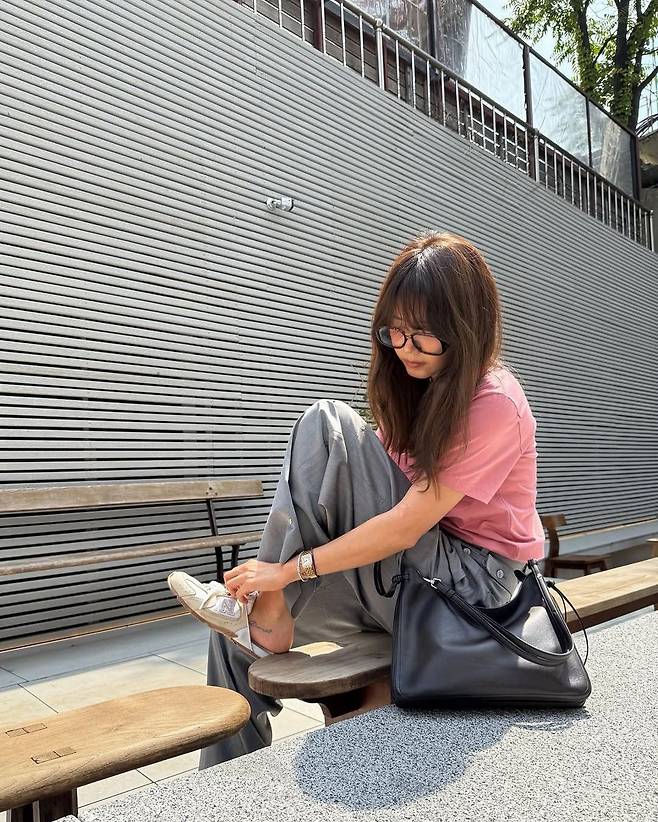 이번 착장의 중심은 바로 톤다운된 핑크 티셔츠다. 채정안은 따뜻한 햇살과 어우러지는 산뜻한 컬러를 선택해 계절감을 살렸으며, 자연스럽게 떨어지는 루즈핏 실루엣으로 편안함을 강조했다. 티셔츠는 단순하지만 그 자체로 강한 존재감을 가지며, 무심한 듯 내추럴하게 스타일링된 헤어와도 잘 어울린다.