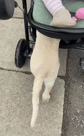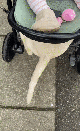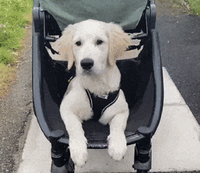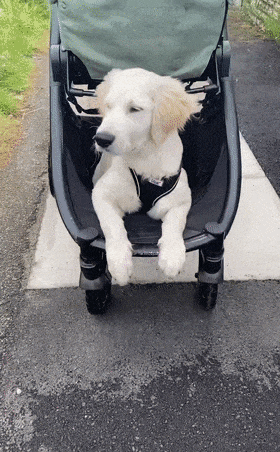 강아지는 아기를 위한 유모차이지만 자신을 위한 공간이 준비돼 있는 것을 알고 있었나봐요!