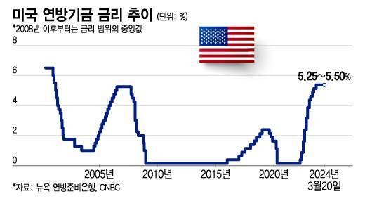 이번 FOMC에서도 금리는 5.25~5.5%로 동결될 것이 거의 확실시된다. CME 금리 선물시장은 이번 FOMC에서 금리가 그대로 유지될 가능성을 96% 이상으로 반영하고 있다.