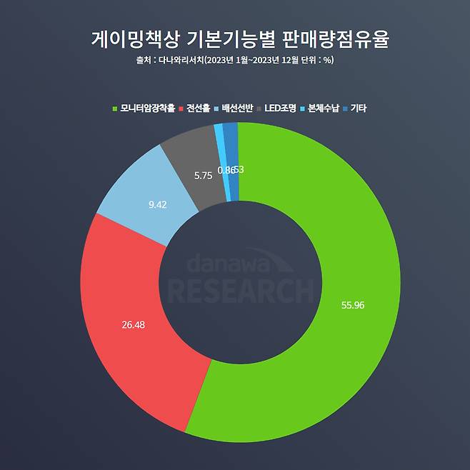 게이머를 위한 편의 기능은 모니터암 장착 홀을 제일 비중이 큰 것으로 나타났다. 판매되는 게이밍 책상의 약 55.96%가 모니터암 장착 홀을 제공한다. 그다음은 전선 홀 26.48%, 배선 선반 9.42%, LED 조명 5.75%로 이어진다. 아무래도 게이밍 책상에는 모니터, 본체 등 전원에 연결할 일이 많다 보니 전선을 정리하거나 조명으로 디자인을 강화하는 부분을 많이 두는 모습이다. 반면 책상 밑에 본체 수납공간을 제공하거나 USB 포트, 상하단 선반이 포함된 제품의 점유율은 낮은 편이다. 이는 PC 본체를 아예 바닥에 두고 사용하거나 화려한 LED 감성을 뽐내며 책상 위에 올려놓는 사람이 많다는 반증이다. 특히 본체 수납공간은 빅타워 케이스의 경우 수납이 불가능할 경우도 있어 일종의 사족으로 여기는 소비자가 많다는 점이 작용한 것처럼 보인다.