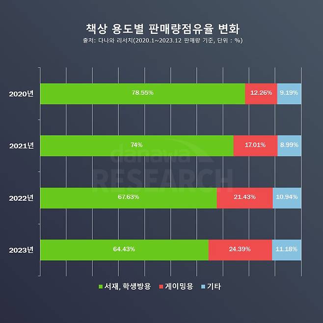 전체 책상 판매량 점유율 중 게이밍 책상이 차지하는 비중도 계속 증가세다. 2020년 12.26%에서 매년 5% 이상 상승하다가 2023년엔 24.39%에 이르렀다. 다나와에서 판매되는 책상 4대 중 1대가 게이밍 책상으로 분류된다는 말이다. 덕분에 서재, 학생방용 일반 책상의 판매량 점유율이 낮아지고 있다. 용도가 용도인 만큼 완벽히 서재, 학생방용 책상을 대체할 수는 없으나 한동안 증가세는 계속 유지될 것으로 전망된다.