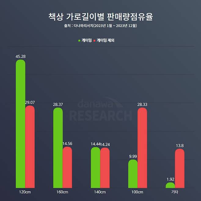 책상을 고르는 기준은 역시 가로 길이가 제일 중요하다. 책상의 가로 길이별 판매량 점유율을 보면 게이밍 책상은 120cm가 45.28%로 제일 많았고 그다음이 160cm 28.37%, 140cm가 14.44%, 100cm가 9.99%로 뒤를 따르고 있다. 반면 게이밍 책상을 제외한 책상 전체 가로길이 비율은 사뭇 다른 모습이다. 100cm 제품이 28.33%로 제일 많고 그다음이 120cm 28.07%, 그다음 160cm, 140cm 제춤이 이어가는 중이다.
